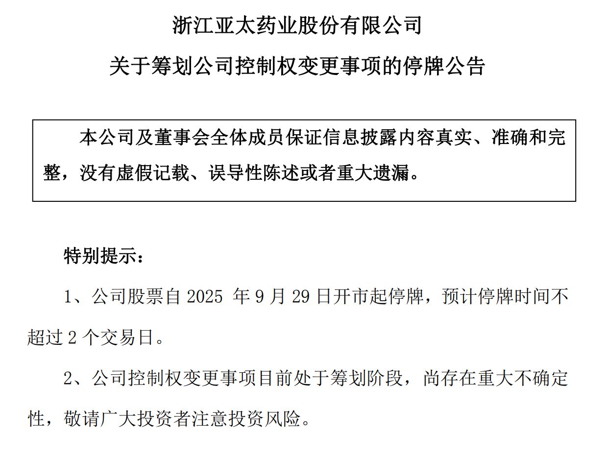 亚太药业公告称,公司于9月26日收到控股股东宁波富邦控股集团有限公司(以下简称“富邦集团”)及一致行动人上海汉贵投资管理有限公司(以下简称“汉贵投资”)、实际控制人宋汉平、傅才、胡铮辉组成的管理团队及一致行动人宋凌杰的通知,其正在筹划公司控制权变更事项,具体交易方案、协议条款等尚需进一步论证和磋商,目前相关各方尚未签署正式交易协议。