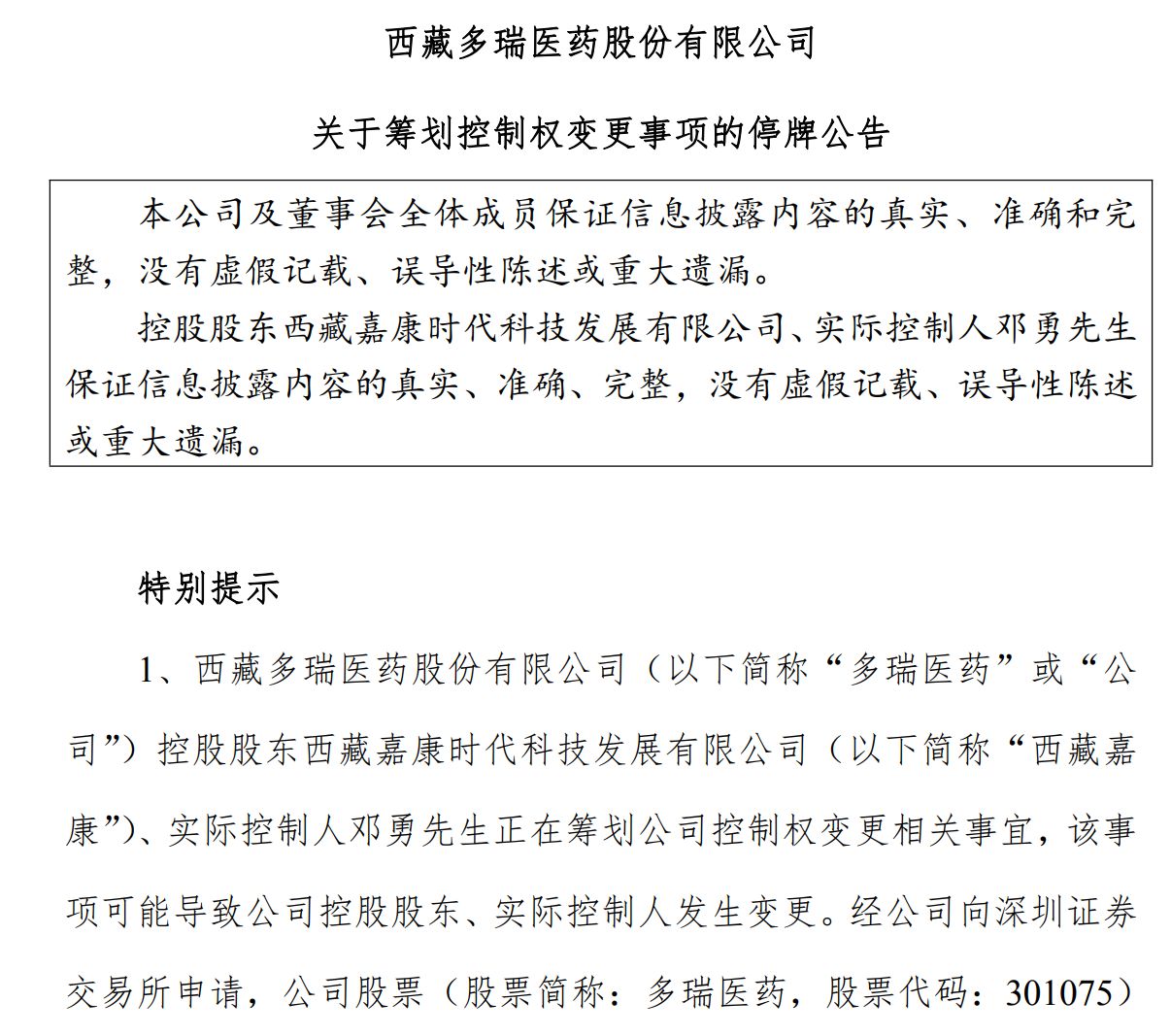 多瑞医药公告称,公司于9月26日收到控股股东西藏嘉康时代科技发展有限公司(以下简称“西藏嘉康”)、实际控制人邓勇的通知,其正在筹划公司控制权变更相关事宜,该事项可能导致公司控股股东、实际控制人发生变更。目前各方尚未签署正式协议,正就具体交易方案、协议等相关事项进行论证和磋商,具体情况以各方签订的正式协议为准。