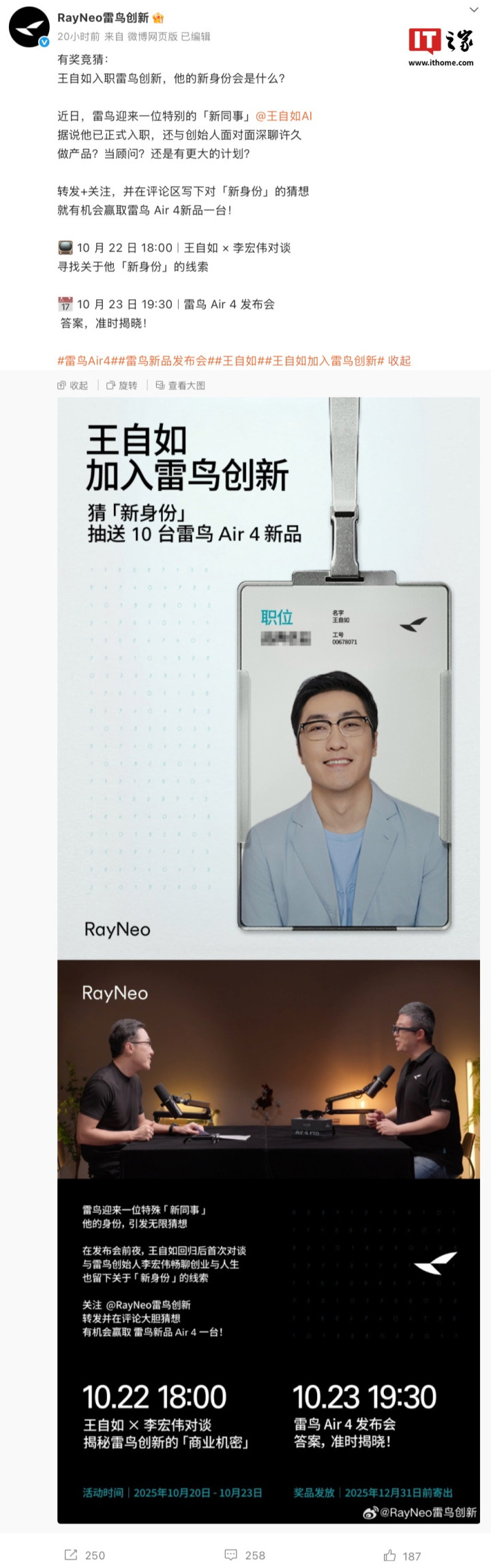 IT之家参考相应海报获悉,10月22日,王自如将与雷鸟创新创始人兼CEO李宏伟进行对谈,称将揭秘雷鸟创新的“商业机密”。而在10月23日晚,雷鸟创新将举行RayNeoAir4新品AR眼镜发布会,届时会揭晓“所有答案”。